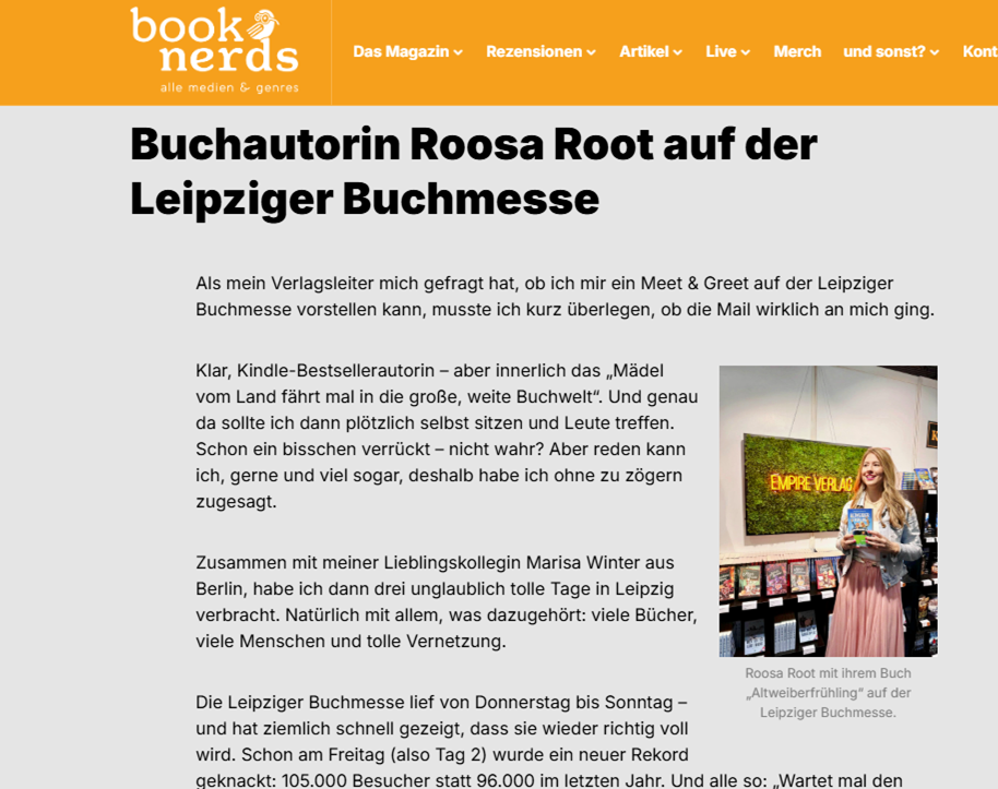 Mit "Altweiberfrühling" und "die Hochzeitsallergikerin" hat Autorin Roosa Root die e-Book charts gestürmt - und ist vom Erfolg ihrer Bücher immer noch geflasht. Gute Laune und Humor will sie verbreiten, und das gelingt ihr ziemlich gut ;)!